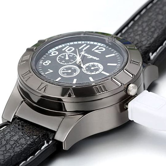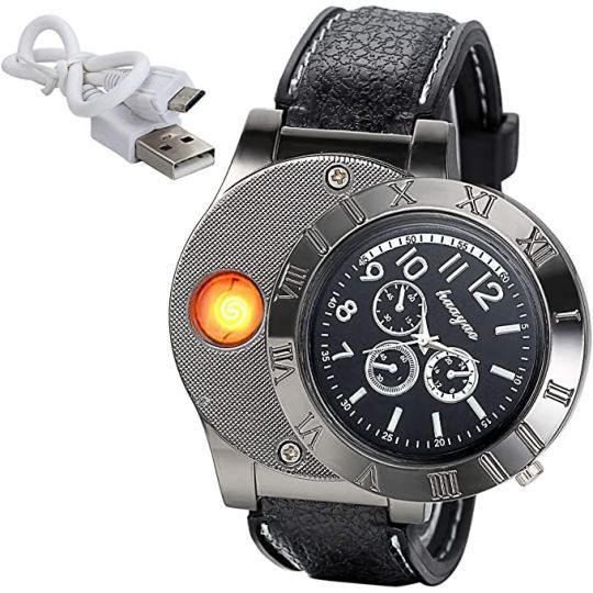 This watch comes with Windproof Lighter which Light in all weather conditions. Having this watch means you can empty out your pockets and leave that lighter at home, as one lighter is built into the watch. Environmentally friendly, without gas, but is USB rechargeable , The watch can charge through the USB interface by a charging cable