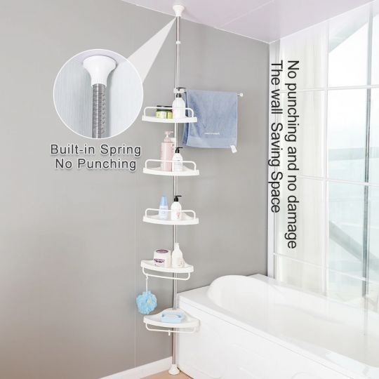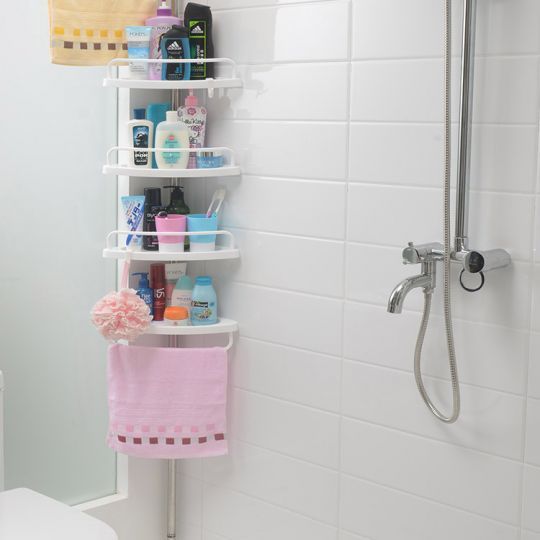 Create space in your bathrooms with this Corner Shelf. Made from lost lasting materials such as ABS plastics and Stainless steel, it features four perforated trays each holding up to 3kg. It is the ideal space-saving rack for as it is uniquely designed to occupy no floor space, thus creating more storage space in your bathroom. It also included three hooks for hanging items, and guard bars to prevent items from falling off the tray. Adjustable 185cm - 310cm