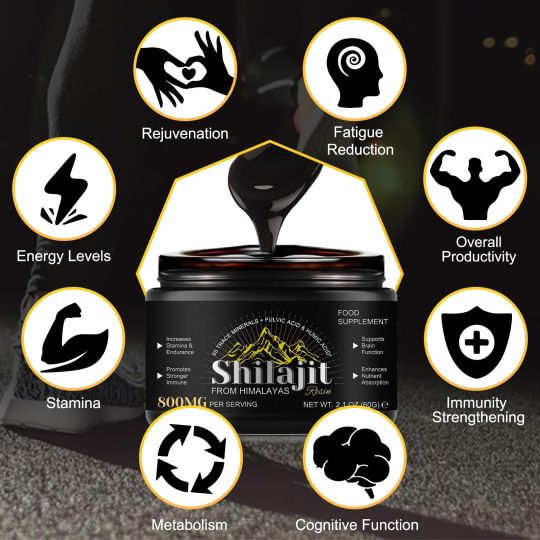 Shilajit Pure Himalayan Organic Shilajit Resin is a premium supplement, rich in over 85 trace minerals and Fulvic Acid. Sourced from high altitudes in the Himalayas, this natural resin supports energy levels and immune health, packaged conveniently in a secure dark glass jar.